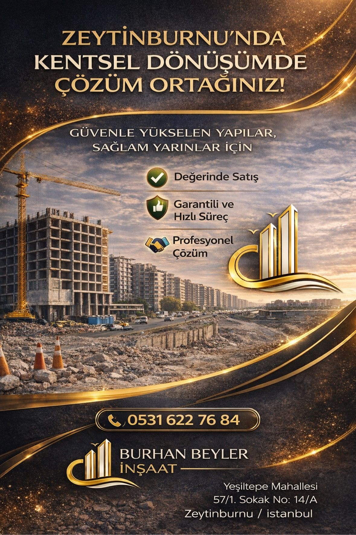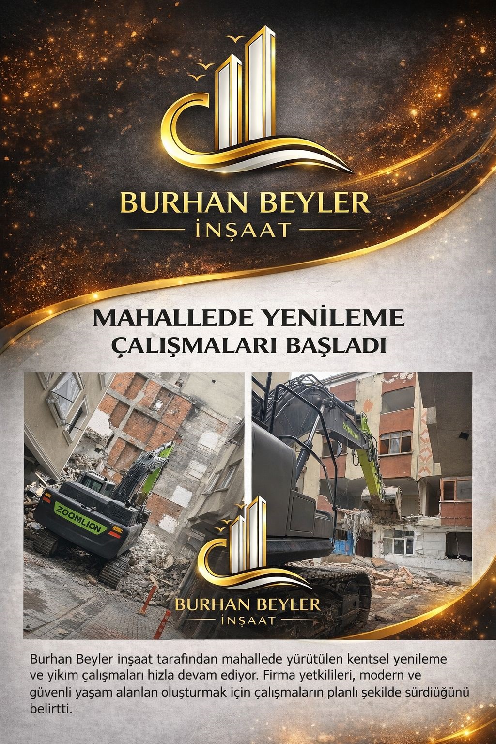 Burhan Beyler İnşaat, dönüşüm sürecine girmek isteyen kat maliklerine açık çağrıda bulunuyor: Sözleşme süreçlerinde şeffaflık, Zamanında teslim, Depreme dirençli yapı üretimi, Güncel yönetmeliklere uygunluk, Uzlaşma odaklı yaklaşım Beyler inşaatın mihenk taşlarını oluşturuyor. Komşularımız bir araya gelip ada bazlı dönüşüm için davette bulunursa memnuniyetle hazırız. Daha güvenli, daha estetik ve daha yaşanabilir bir Zeytinburnu için birlikte çalışabiliriz.”