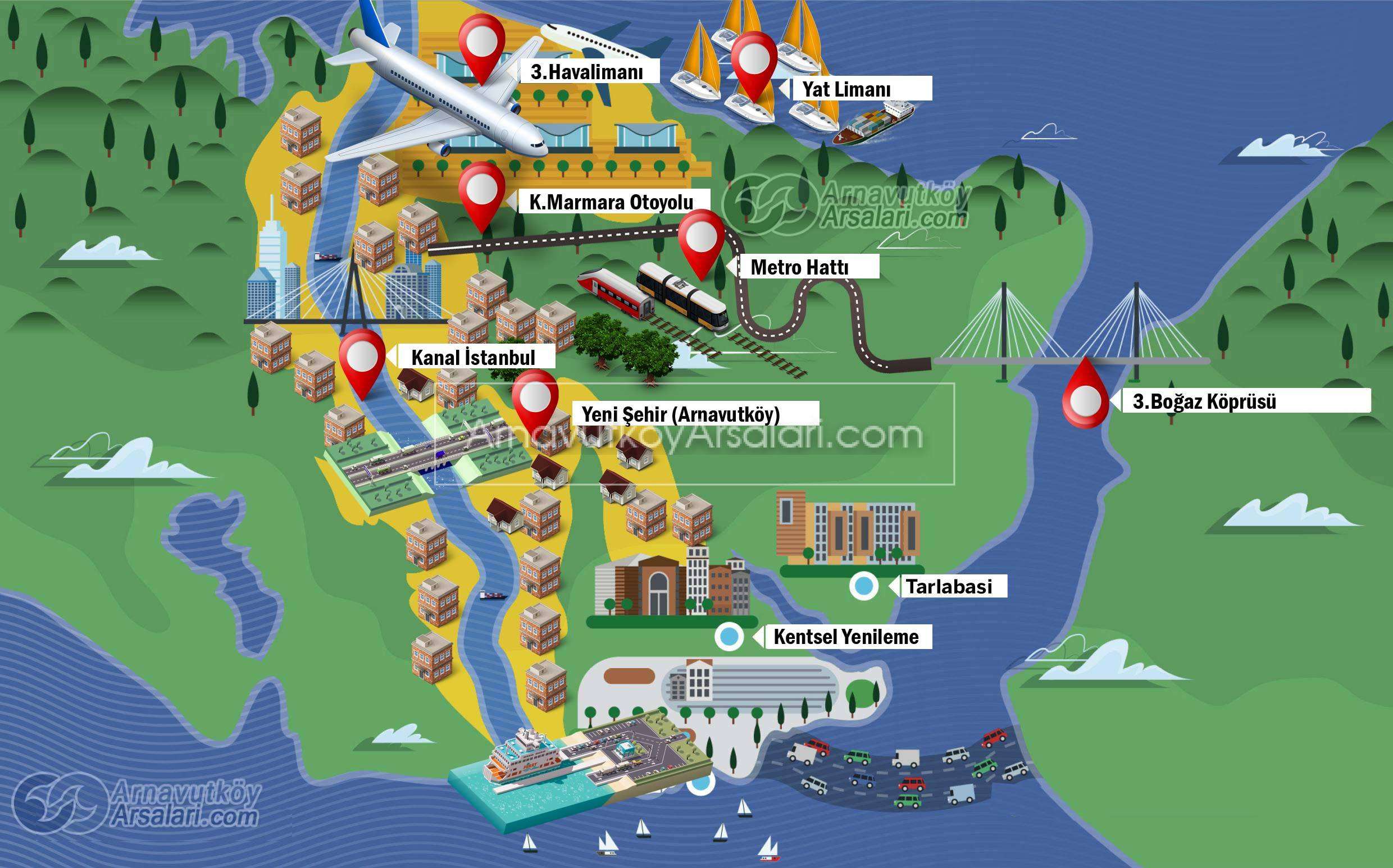 Kanalın Marmara Denizi ile birleştiği noktada 2023 yılına kadar Cumhurbaşkanı Erdoğan'ın açıkladığı iki yeni kentten biri kurulacak. 453 milyon metrekareye kurulması planlanan yeni şehrin 30 milyon metrekaresini Kanal İstanbul oluşturacak. Yeni şehrin en önemli aktörlerinden biri ise 76 milyon m2 alan içinde yer alacak olan 3. Havalimanı olacak.