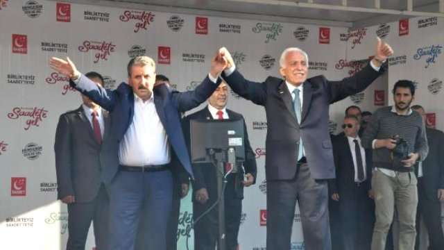 BBP Genel Başkanı Mustafa Destici, 7 Haziran seçimleri öncesinde Saadet Partisi ile ittifak yaptıklarını belirterek, “Biz, batıya kul köle olalım diye bir araya gelmedik. Onların dediklerini yapalım da iktidar olalım diye bir araya gelmedik. Biz, Adriyatik’ten Çin seddine, Suriye’den Myanmar’a Türk-İslam coğrafyasındaki Müslüman kardeşlerimizin gözyaşını dindirmek için bir araya geldik. Biz, zengini daha zengin, fakiri daha fakir yapalım diye değil gelir dağılımındaki adaletsizliği sona erdirmek için bir araya geldik. Yargının köküne dinamit koyanların yaptığı tahribatı durdurmak ve ülkemizde herkes için adaleti hakim kılmak için bir araya geldik. Eğitim sistemimizi yenileyip milli ahlaka, kuran ahlakına sahip bir nesli yetiştirmek için bir araya geldik” diye konuştu.